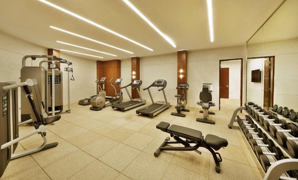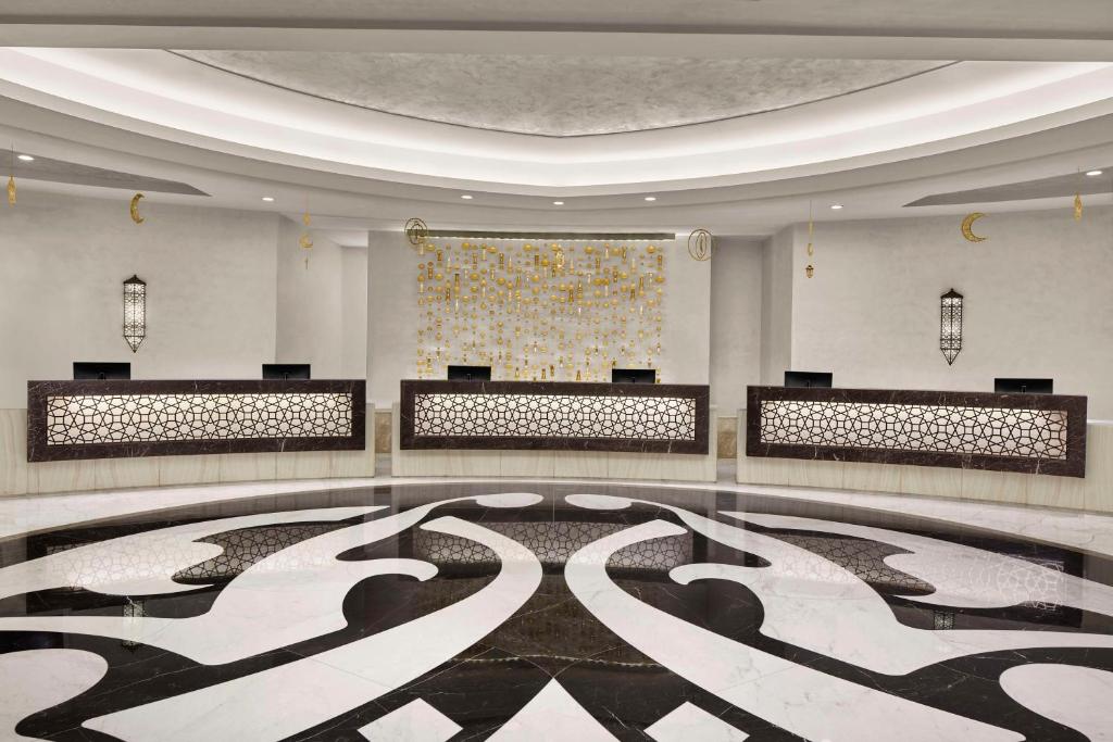 The hotel features modern amenities such as concierge services, a fitness center, prayer rooms, and luxurious rooms designed for comfort.