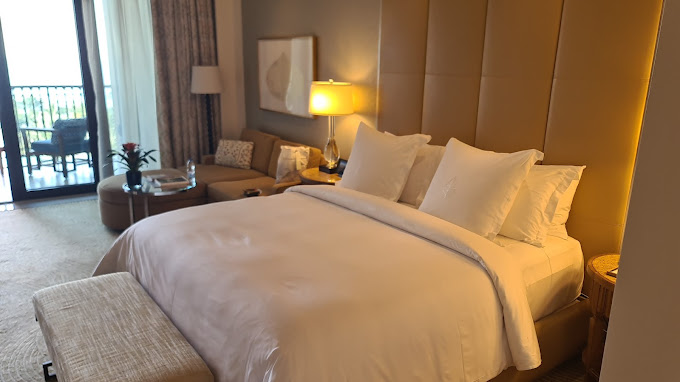 The resort offers elegantly designed guest rooms, suites, and villas, each featuring modern comforts and private balconies with breathtaking Gulf or garden views.