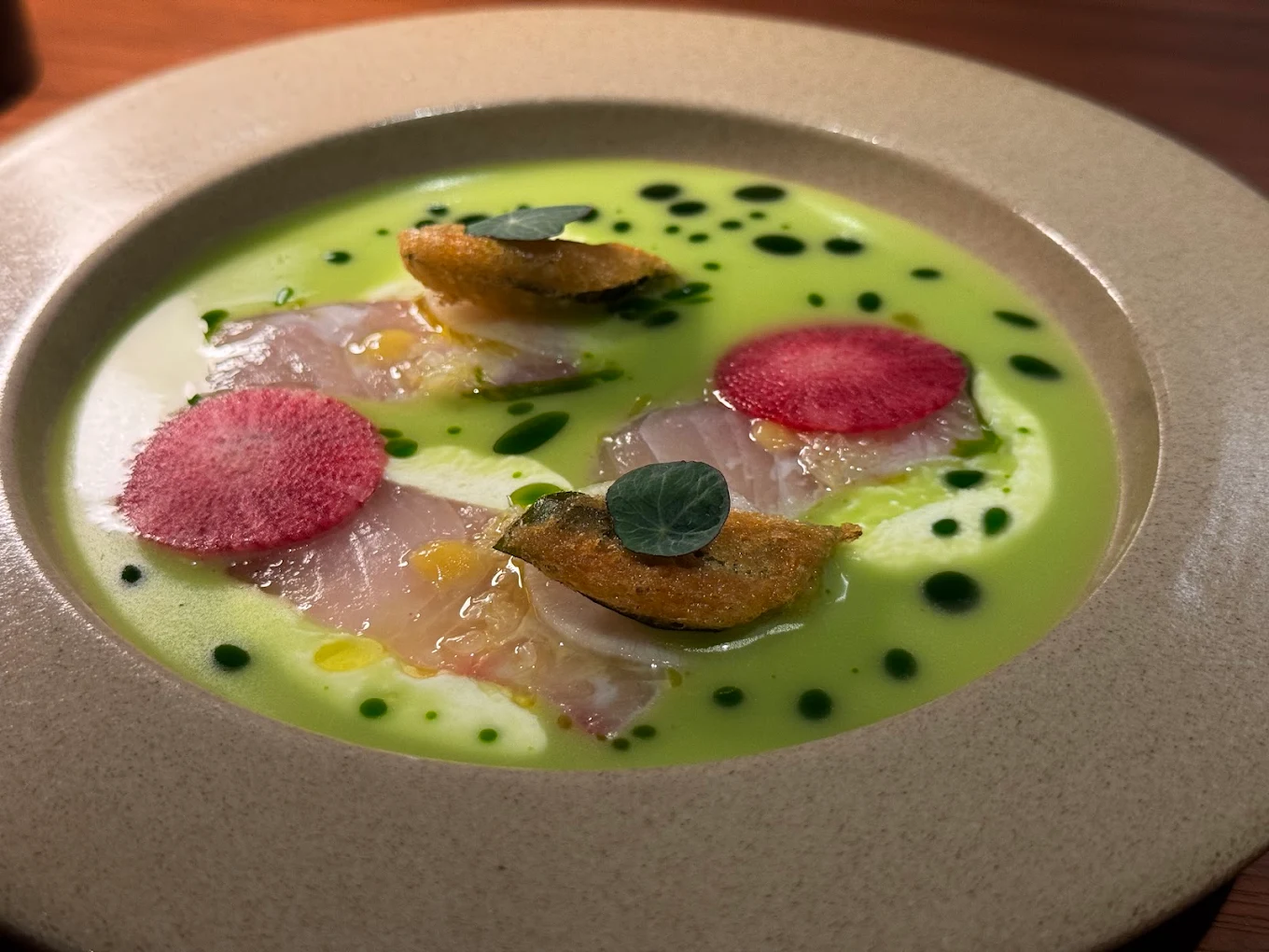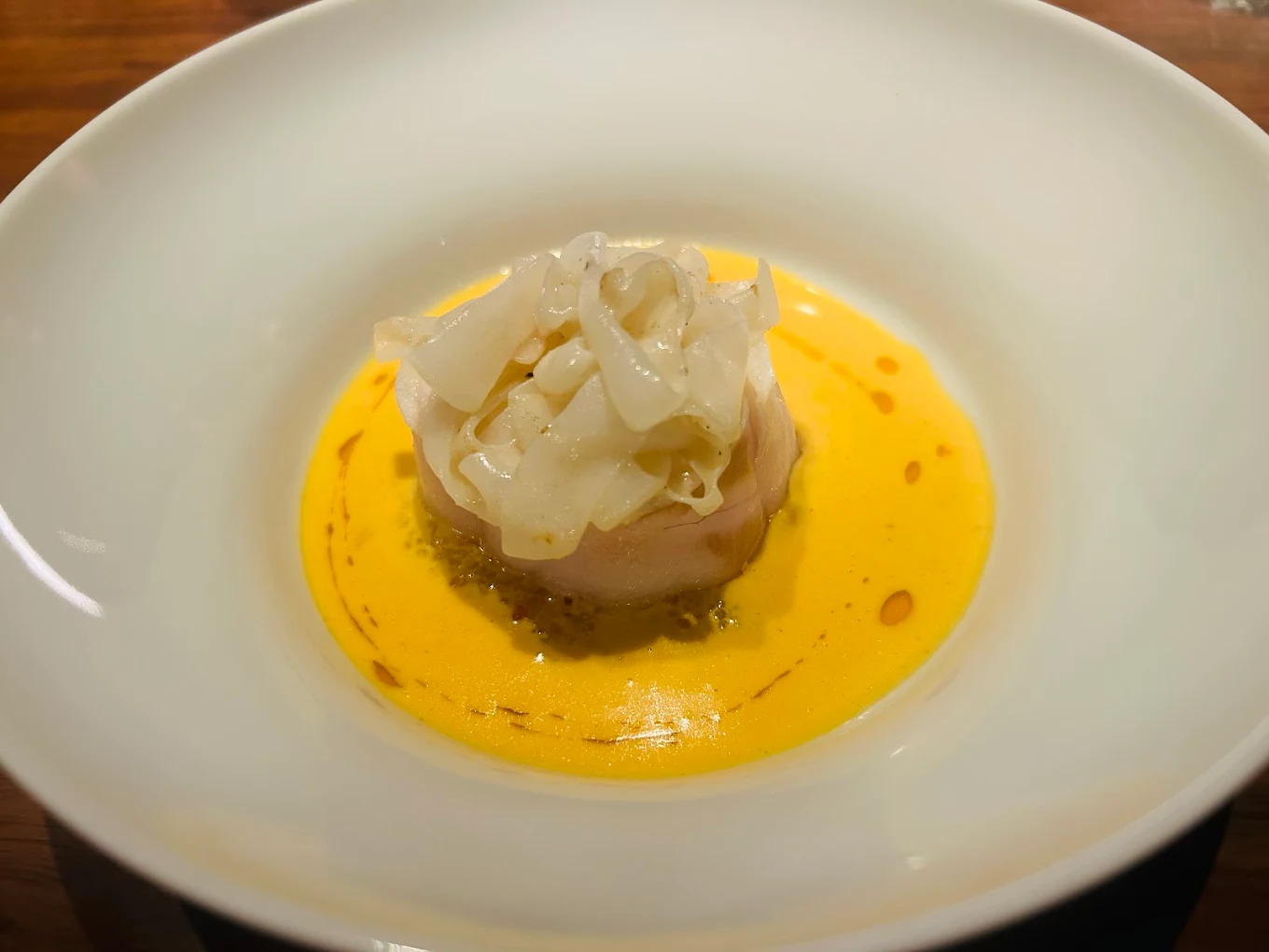 The atmosphere is sophisticated yet warm, blending contemporary art and gastronomy. The open kitchen allows diners to watch the chefs work with precision and creativity. The food leans into French techniques with global influences, and each dish is elegantly plated and thoughtfully composed. Wine pairings and an optional premium wine experience are available to complement the meal.