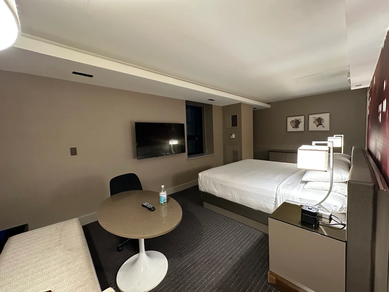 Fitness center (though in some reviews the gym was under renovation) Onsite dining / food & beverage (though limited in some phases) The hotel was renovated to include a glass façade, three‑story atrium, and restoration of the Commodore’s original ballroom. Many guests note no minibar, no room service in some rooms, and absence of coffee makers in rooms. Bathrooms and in‑room amenities are basic: soap, shampoo, conditioner; some guests complain about wear or outdated fixtures