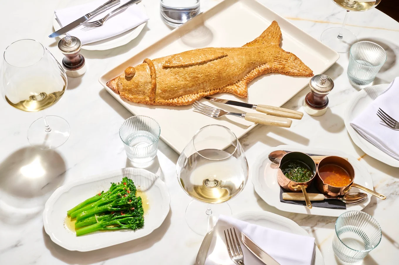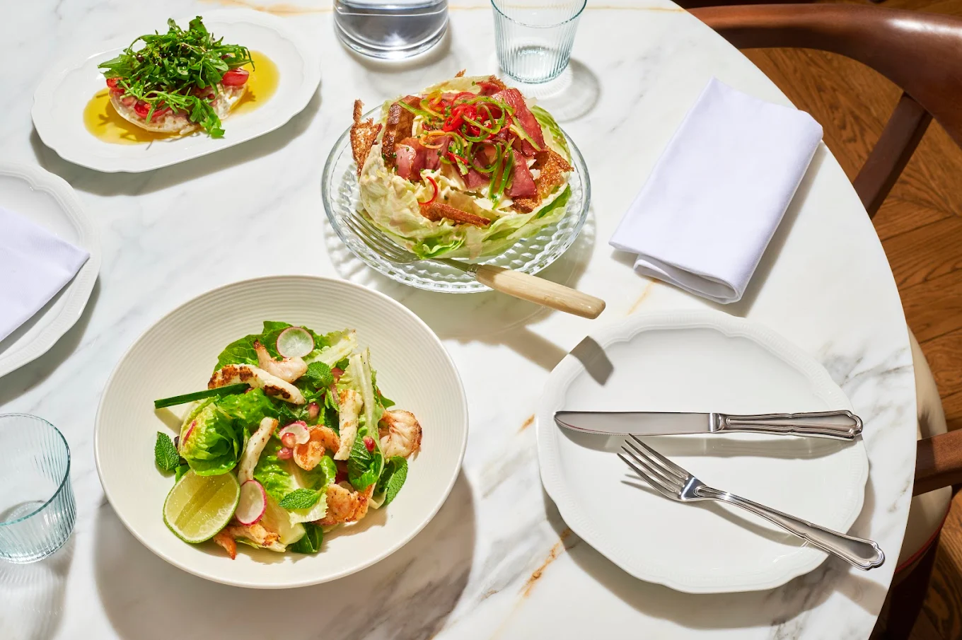 The menu blends classic French technique with Mediterranean warmth, featuring dishes like truffle scrambled eggs, seafood risotto, Wagyu burgers, and whole roasted baby chicken in Périgueux sauce. Freshly baked pastries and delicate desserts—such as crème brûlée and saffron milk cake—highlight the kitchen’s finesse.