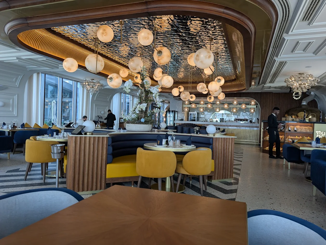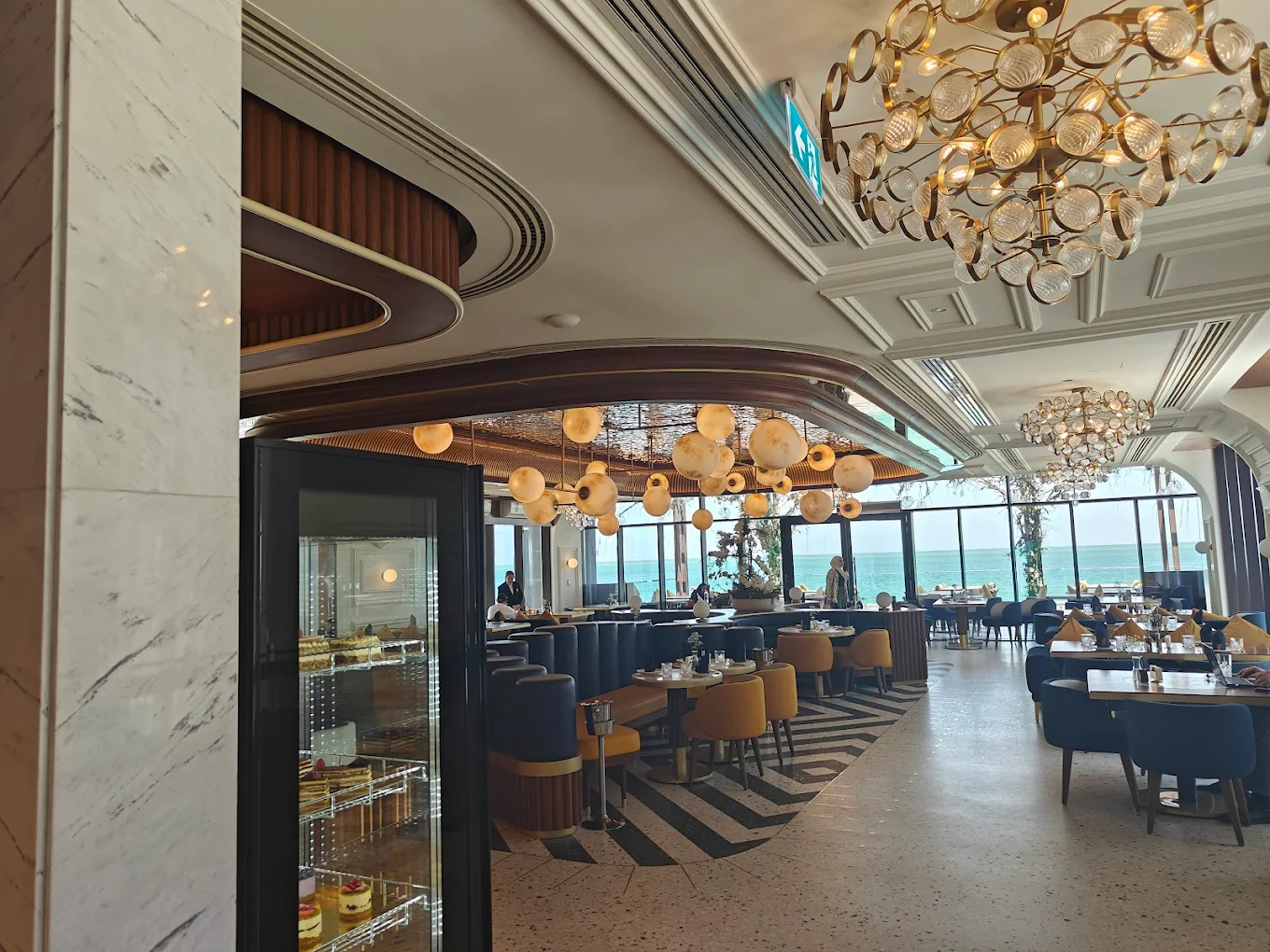 The lounge offers a sophisticated and elegant atmosphere, featuring Art Deco-inspired interiors with bold geometric shapes, intricate brass and marble panels, and a ceiling clad in rippled steel that mimics the moonlit sea. Guests can enjoy both indoor and outdoor seating with stunning views of the Arabian Gulf.
