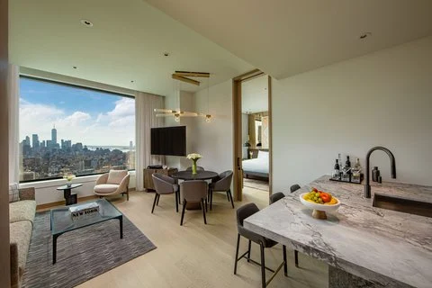 The hotel features 250 beautifully appointed rooms, including 31 suites and 16 lavish penthouse residences, many with panoramic views of New York City. The interiors reflect a sophisticated design inspired by nature and the dynamic energy of the surrounding neighborhood.