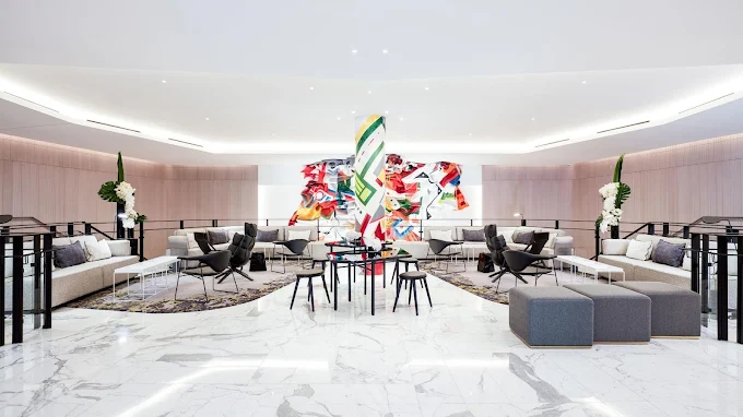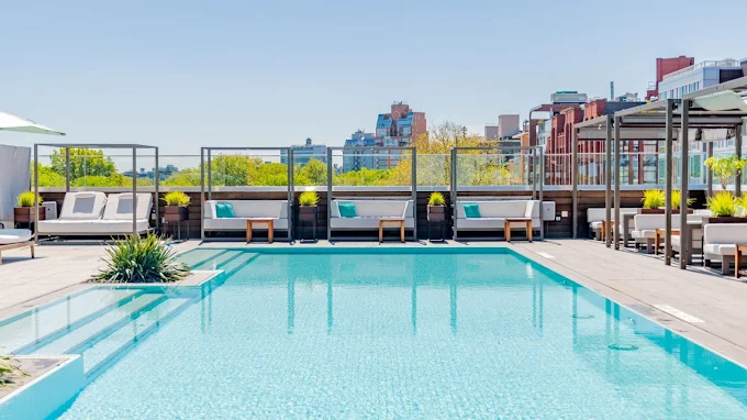 The aesthetic is sleek and contemporary, with interiors that balance clean lines, curated art, and thoughtful design details. Signature amenities include a rooftop bar (Westlight) with 360-degree city views, a 60-foot outdoor pool (the longest hotel pool in NYC), and Leuca, a Southern Italian restaurant by renowned chef Andrew Carmellini.