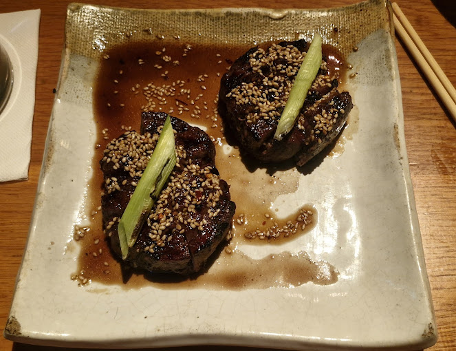 The menu features an array of contemporary Japanese dishes, including sushi, sashimi, tempura, and robata-grilled specialties. Signature dishes include the miso-marinated black cod and spicy beef tenderloin with sesame.